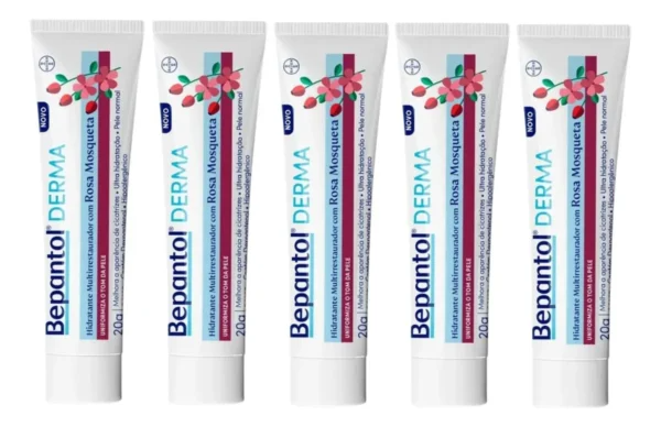 O kit contém 5 cremes hidratantes multirestauradores de 20g cada, que combinam óleo de rosa mosqueta com Pró-Vitamina B5+.
